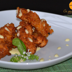 Se iau fasiile de pui,se dau intai prin aluat tempura,dupa care se dau prin fulgii de porumb si se prajesc/baga la cuptor.