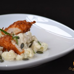 3.Se pune intr-un castron,se adauga cateva linguri de maioneza sanatoasa,se potriveste de sare si piper,dupa care se adauga semintele de dovleac.